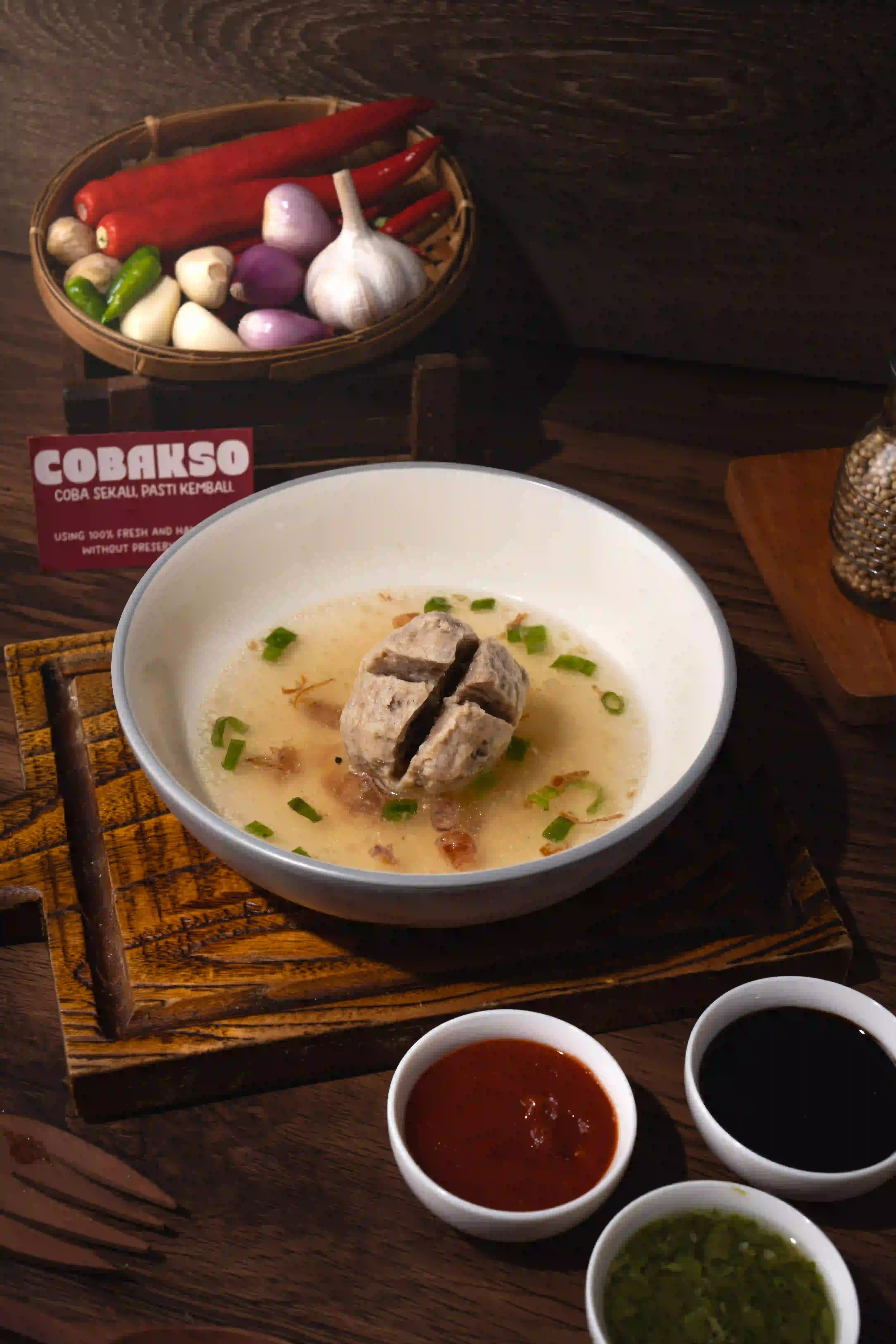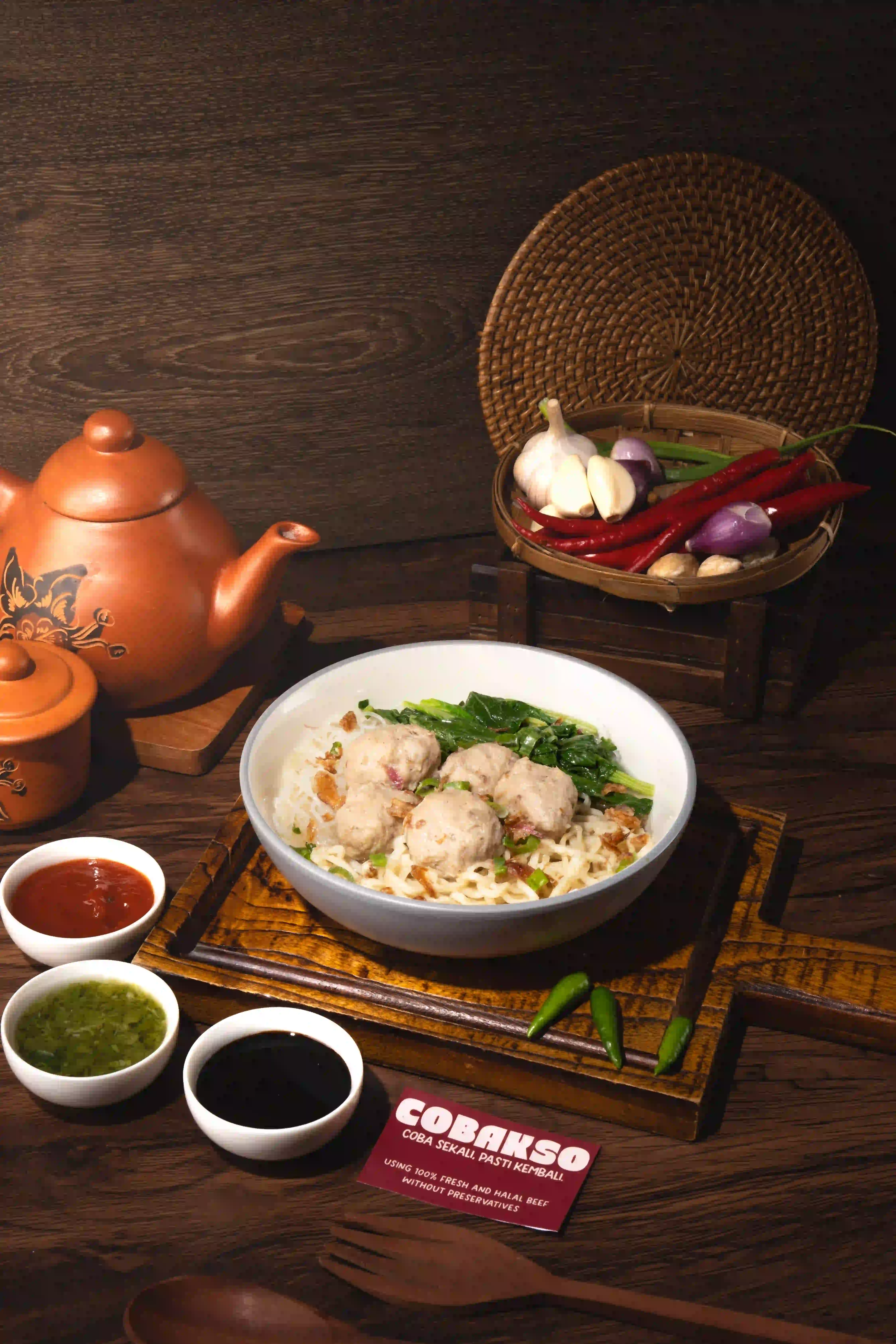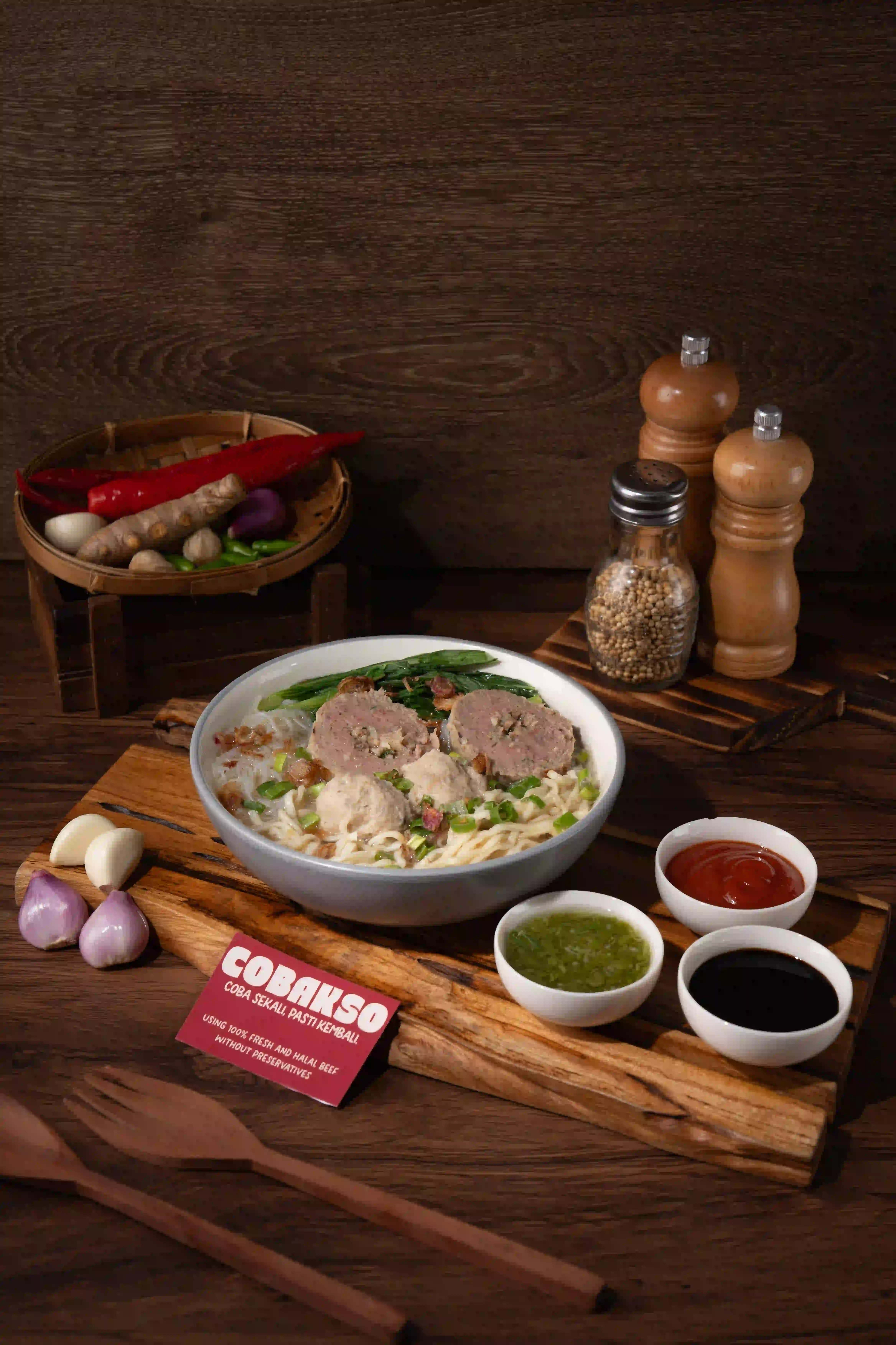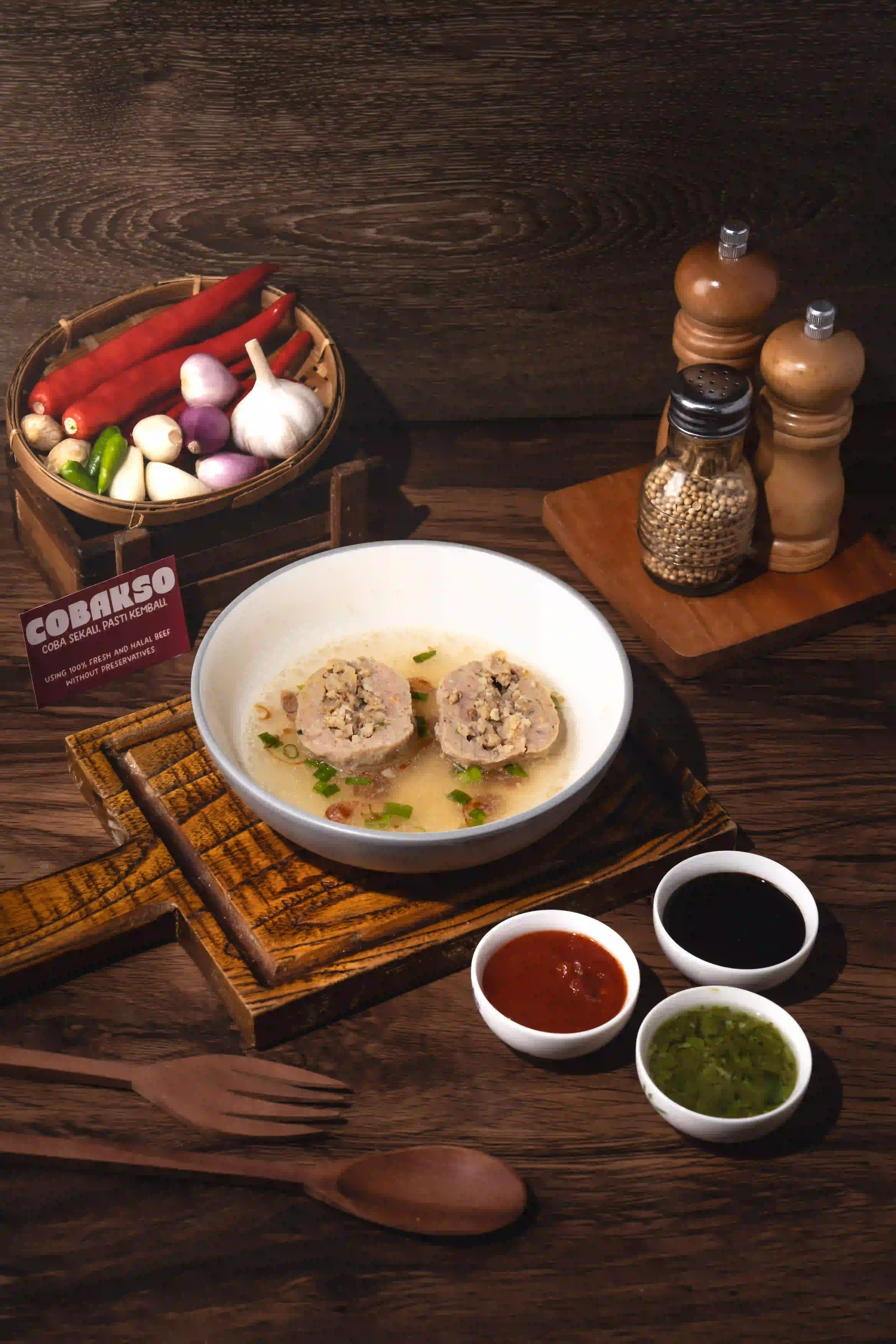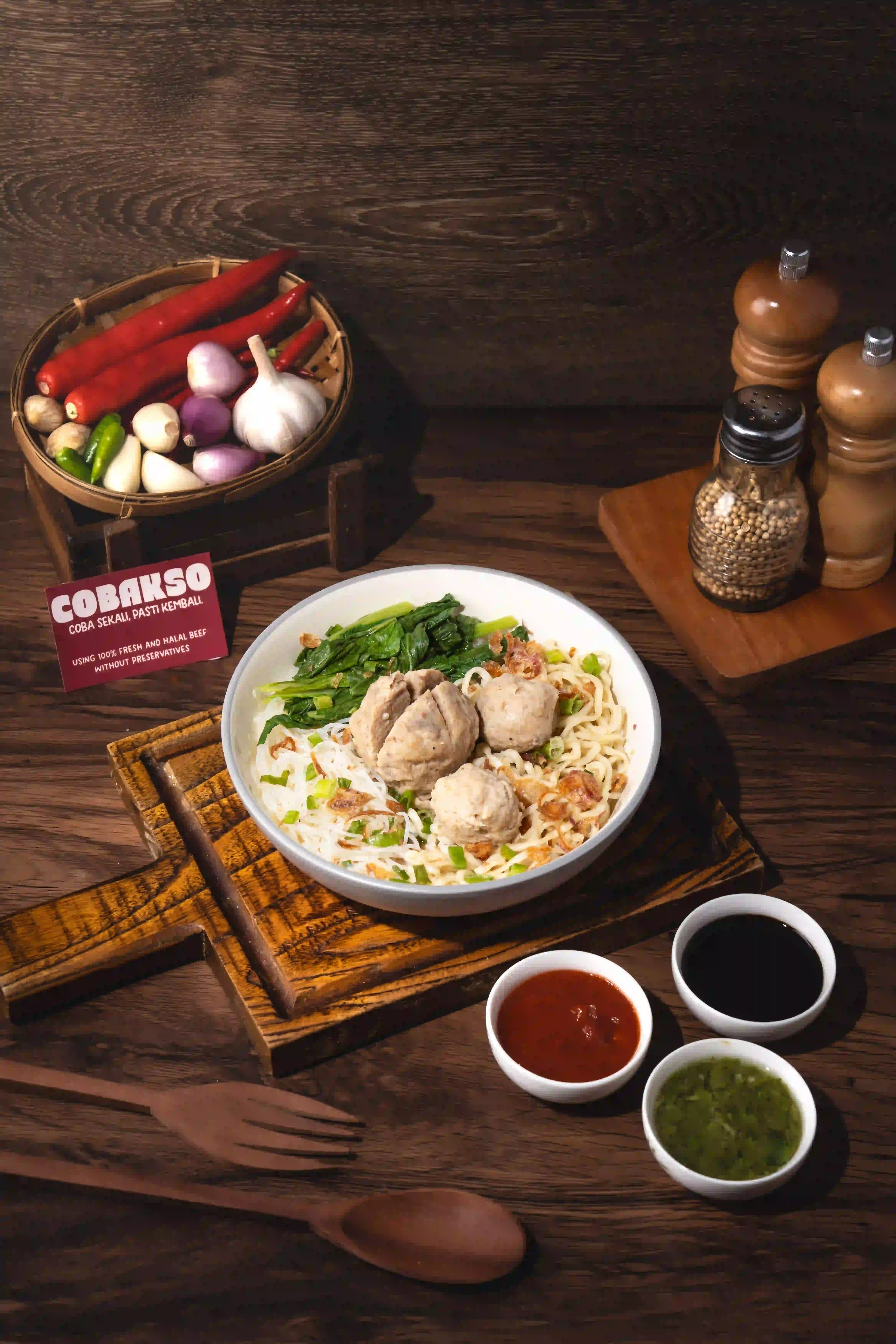 Bakso Cincang dan Bakso Kecil dalam kuah kaldu gurih, lengkap dengan mie, sawi, dan bawang. Fresh. Halal. Premium.